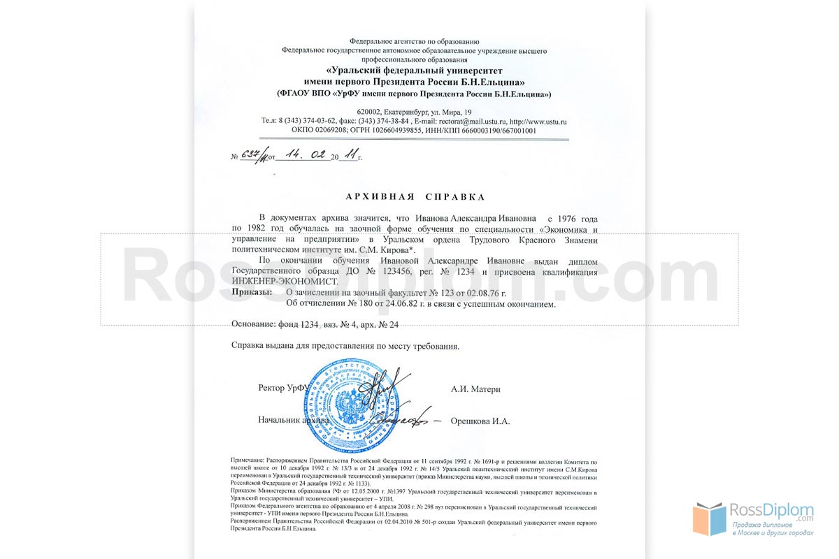 Мы изготавливаем архивные справки абсолютно идентичные тем, которые выдают в образовательных учреждениях: она содержит полное название учебного заведения, его реквизиты, информацию о студенте, годы его обучения, присвоенную квалификацию, номер и серию выданного диплома. Помимо этого, архивная справка может содержать (по желанию) сведения о качестве полученного обучения, т.е. список прослушанных дисциплин с итоговыми оценками и расчасовкой. Нужно ли говорить о том, что работая с профессионалами, Вы получите документ со всеми необходимыми печатями и подписями?